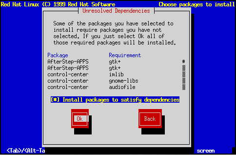 After you have finished selecting packages to install, the installation program checks the list of selected packages for dependencies. If any package requires another package which you have not selected to install, the program presents a list of these unresolved dependencies and gives you the opportunity to resolve them (see Figure 8-36). If you simply press Ok, the program will resolve them automatically by adding all required packages to the list of selected packages.