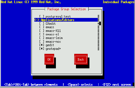 For example, to see the list of packages in the Applications/Editors category, use the arrow keys to select this group and press Enter or Space. When you do, the "+" sign (closed) changes to a "-" sign (open) and a list of packages in this category appears (Figure 8-35). An "*" appears beside currently selected packages and a " " beside unselected packages. Press the Enter or Space keys to select or deselect packages.