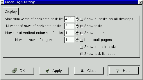 The GNOME Pager Settings dialog contains two tabs, the Pager and the Tasklist tabs. The Pager tab allows you to change the setting for the Pager (graphical representation of desktops) and the Tasklist tab allows you to change the settings of your Tasklist (list of open applications on your desktop).