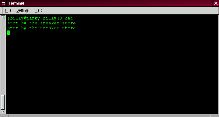 So it's not too exciting. But cat has just demonstrated the definition of standard input and standard output. Your input was read from the keyboard (standard input), and that input was then directed to your terminal (standard output).