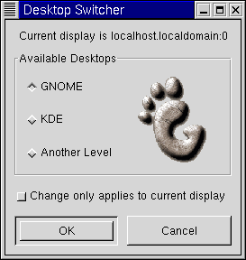 You can change environments by using the Switchdesk utility (see Figure 2-10). Whether you're using GNOME, KDE or AnotherLevel, you can select your new environment in Switchdesk and log out. When you restart your session, you'll find your new environment.