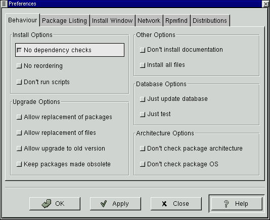 Under Behavior, you'll find a number of options for configuring the way Gnome-RPM installs, uninstalls and upgrades packages. The Behavior tab is split into five sections: Install, Upgrade, Other, Database and Architecture. (See Figure 10-4 for an example.) Note that by default these boxes are not checked.