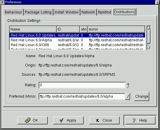 In Distribution Settings, you can set the options for choosing the most appropriate package out of the selections Rpmfind returns, as well as which mirror you would like to use. The higher the rating you indicate for your selection (as shown in Figure 7-9) the higher the priority it will receive; the lower rating, such as "-1," will specify that packages not be recommended.