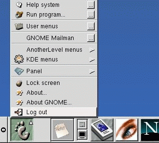 To log out from GNOME, click once on the Main Menu Button on the Panel and drag your mouse cursor to the first item, labeled Log out (as in Figure 1-7).