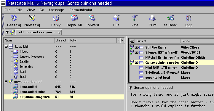 When you are finished subscribing to newsgroups, click the OK button. Your selections will appear in Messenger's main dialog (see Figure 7-21). Note that the Total category represents the total number of messages in the group; the Unread category represents the number of messages you have not read.