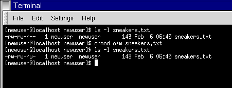 [newuser@localhost newuser]$ chmod u+rw sneakers.txt [newuser@localhost newuser]$ cat sneakers.txt buy some sneakers then go to the coffee shop then buy some coffee bring the coffee home take off shoes put on sneakers make some coffee relax! [newuser@localhost newuser]$ |