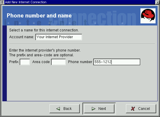 In the Phone number and name dialog (see Figure 6-6), you should enter both the name you would like to give your account and the telephone number of your ISP. Usually, it isn't necessary to provide the prefix or area code for your ISP.