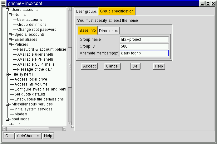Linuxconf will prompt you to enter the new password. There is also a field called Confirmation where you will need to type the password again. This is to prevent you from mistyping the password. See the section called Adding a User Account for guidance on choosing a password. If you decide against changing the password, select Cancel. Once you have entered the new password select Accept.