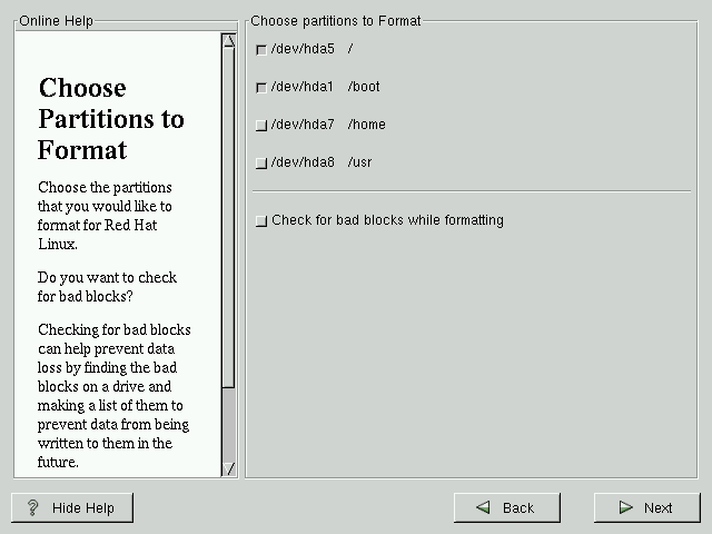 Choose the partitions that you would like to format. All newly created partitions should be formatted. In addition, any existing partitions that contain data you no longer need should be formatted. However, partitions such as /home or /usr/local must not be formatted if they contain data you wish to keep (see Figure 6-8).
