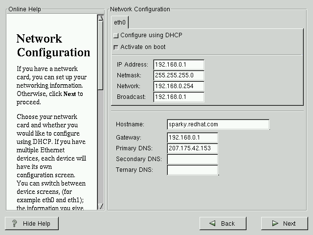 Choose your device type and whether you would like to configure using DHCP. If you have multiple Ethernet devices, each device will keep the information you have provided. You may switch between devices, for example eth0 and eth1, and the information you give will be specific to each device. If you select Activate on boot, your network interface will be started when you boot. If you do not have DHCP client access or are unsure as to what this information is, please contact your network administrator.