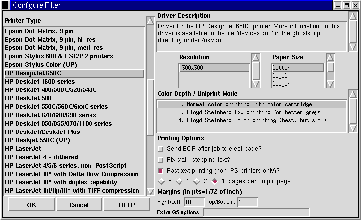 • Extra GS options -- Refers to additional Ghostscript options which may be available for your printer. In general, you can leave this blank. Check in the Driver Description box for any options you might be required to add here.