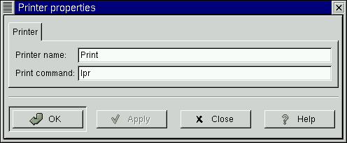 In Printer properties (see Figure 5-15), you can select a name for the printer label on the Panel. Your default print command will most likely be lpr, so you should leave the Print command entry the default lpr.
