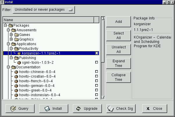 Gnome-RPM provides you with a choice of package views (as shown in Figure 10-3). You can filter your views for