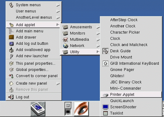 To add the applet to the Panel, right-click on the Panel and drag your cursor to Add Applet => Utility => Printer Applet (see Figure 5-14). Release your mouse button over Printer Applet; the applet will appear on your Panel and look like: